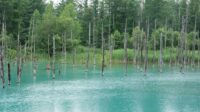 青い池の記事でもご紹介しましたが、美瑛川の水は多くのアルミニウムを含むために青っぽい色調をしています。この場所は水深が浅いので青とまではいえないけど、綺麗な水色をしていてとても非現実的な光景でした。
